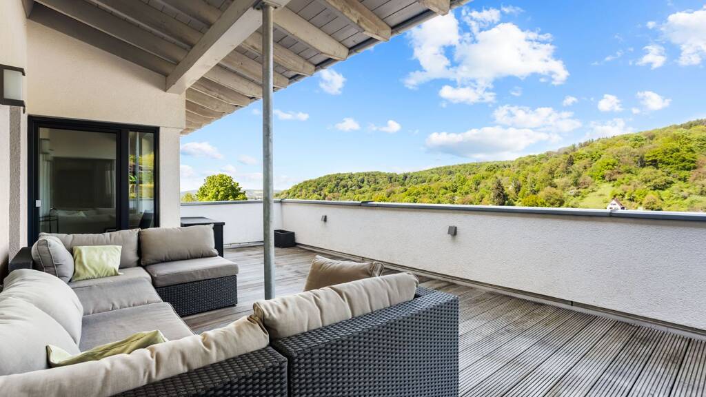 Komplettiert wird das Raumangebot dieses besonderen Wohnhauses noch durch die Ebene im Dachgeschoss, welche durch das Pultdach über besonders hohe Decken verfügt. Hier stehen Ihnen zwei Kinderzimmer mit eigenem Duschbad, sowie der Elternbereich mit Masterbad, Ankleide und Schlafzimmer zur Verfügung. Sowohl vom Flurbereich als auch vom Badezimmer oder Elternschlafzimmer haben Sie Zugang zur imposanten Dachterrasse, die Ihnen einen traumhaften Fernblick auf das Kinzigtal und den Gelnhäuser Stadtwald bietet. Ein wirkliches Highlight dieser Etage und des gesamten Hauses.
