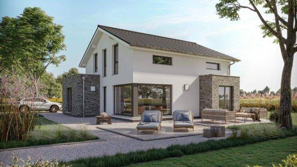 Das Haus ist auf einem realen Baugrundstück geplant oder auf einem Grundstück in einer Planungsphase. Die Bilder zeigen ggf. Extras, die im Rahmen des Bebauungsplans noch geprüft werden müssen.