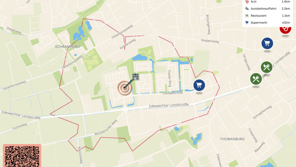 Die Wohnung befindet sich in einer ruhigen Wohnstraße im Stadtteil Eversten. Die Nachbarschaft ist geprägt von gepflegten Einfamilien- und Mehrfamilienhäusern sowie großzügigen Grünflächen. Einkaufsmöglichkeiten wie Supermärkte und Drogerien liegen in fußläufiger Reichweite (ca. 600 Meter). Die Oldenburger Innenstadt erreichen Sie bequem in etwa 10 Minuten mit dem Auto oder in ca. 15 Minuten mit dem Fahrrad (3,5 Kilometer). Für einen entspannten Aufenthalt im Grünen lädt der Eversten Holz, ein beliebtes Waldgebiet, in ca. 650 Metern Entfernung ein. Für Familien mit Kindern sind Kindergärten und Schulen ebenfalls in der Nähe, so ist die nächste Grundschule nur rund 800 Meter entfernt. Die öffentliche Verkehrsanbindung ist ausgezeichnet: Eine Bushaltestelle mit Verbindungen ins Stadtzentrum und umliegende Ortsteile ist etwa 300 Meter entfernt. Der Stadtteil bietet zudem ein abwechslungsreiches gastronomisches Angebot und verschiedene Sportmöglichkeiten in direkter Nähe.