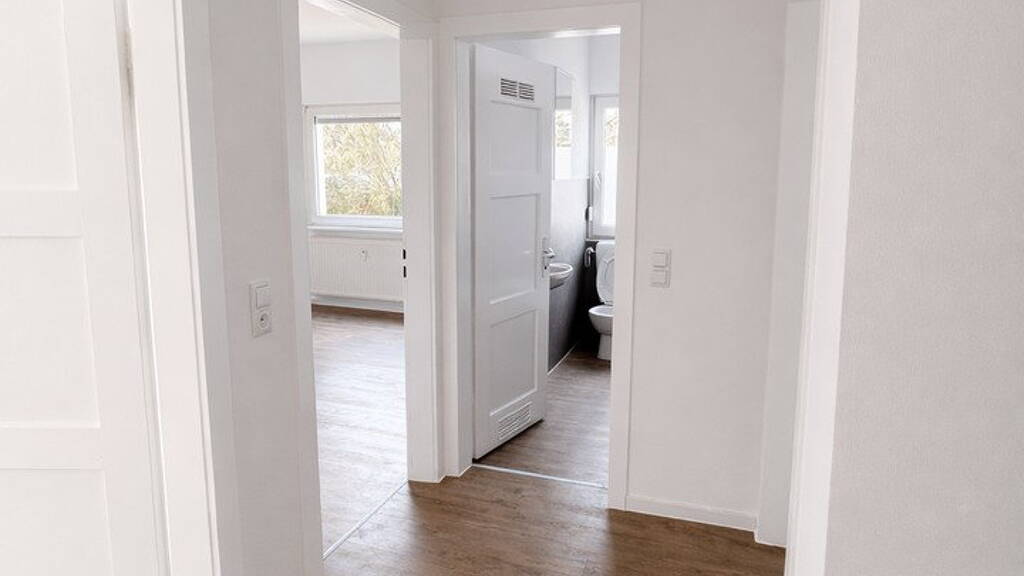 In der gesamten Wohnung wurde ein moderner Boden in Holzoptik verlegt, der den Räumen eine warme und hochwertige Ausstrahlung verleiht. Die Wände sind neutral gehalten und ermöglichen eine unkomplizierte Einrichtung.