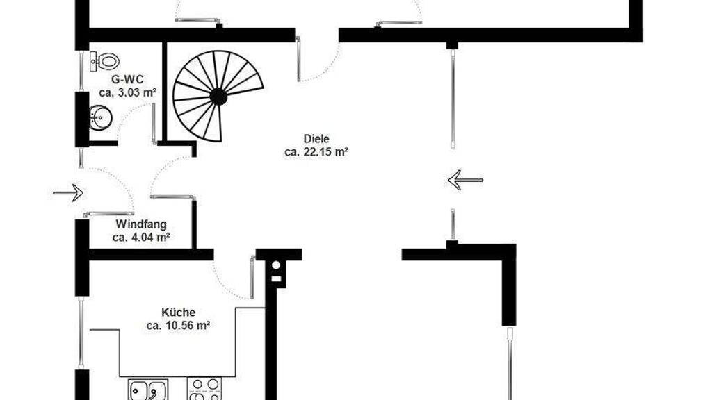 Sie begehen die Immobilie über einen praktischen Windfang mit ca. vier m², der als Garderobe zwischen Außen- und Innenbereich dient. Von hier aus gelangen Sie in die großzügige Diele mit ca. 22 m², die das Herzstück des Erdgeschosses bildet und alle Räume harmonisch miteinander verbindet. Eine Wendeltreppe setzt dabei einen architektonischen Akzent und führt in das Kellergeschoss. Rechter Hand öffnet sich der weitläufige Wohnbereich mit ca. 29 m². Große Fensterflächen sorgen für viel Tageslicht und schaffen eine einladende Atmosphäre. Der angrenzende Kaminbereich mit knapp 12 m² bietet ausreichend Platz für gesellige Stunden mit Familie oder Gästen. Die separate Küche mit ca. 10,5 m² ist funktional geschnitten und gut erreichbar. Im vorderen Bereich des Erdgeschosses befinden sich ein gut geschnittenes Zimmer mit ca. 10 m² - ideal als Arbeits-, Gäste- oder Kinderzimmer sowie ein großzügiges Schlafzimmer mit ca. 20 m². Das Badezimmer mit rund 8 m² ist mit Badewanne, Dusche und Doppelwaschtisch ausgestattet und bietet komfortable Dimensionen. Ergänzt wird das Raumangebot durch ein Gäste-WC mit ca. drei m². Im Keller finden Sie teilweise wohnlich anmutende Räumlichkeiten, Hobbyräume, ein Gäste-WC und die Garage.