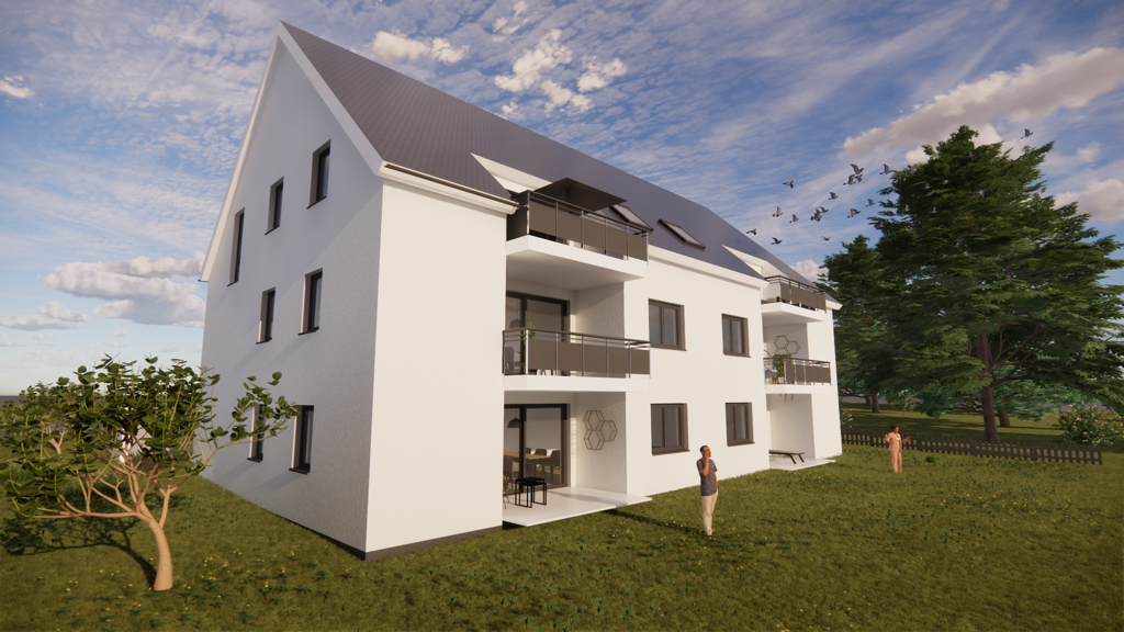 Das zur Sonnenseite ausgerichtete Mehrfamilienhaus mit 6 Eigentumswohnungen auf 3 Etagen fügt sich stimmig in die gewachsene Wohnumgebung ein Ausgestattet mit einem Aufzug ist es bestens geeignet für Bewohner jeden Alters. Durch den neuesten Massivbau-Standard entsteht ein „Klimafreundlicher Neubau“ als förderfähiges EFFIZIENZHAUS 40 QNG PLUS mit zertifizierter Nachhaltigkeit. Käufern stehen dafür zinsgünstige Kredite der KfW-Förderbank zur Verfügung. Im Falle einer Vermietung können Investoren und Kapitalanleger zusätzlich umfangreiche Abschreibungsmöglichkeiten in Anspruch nehmen. Die Beheizung mit Wärmepumpe in Verbindung mit einer PV-Anlage auf dem Dach unterstreicht das energetische Konzept und optimiert die Energiebilanz. Großzügige Fensterflächen und eine Schiebtüre zur Südterrasse bringen viel Licht in den Wohnbereich und zusätzlichen Komfort. Als Abstellraum für Fahrräder, Kinderwägen etc. steht ein Nebengebäude zur gemeinschaftlichen Nutzung bereit.