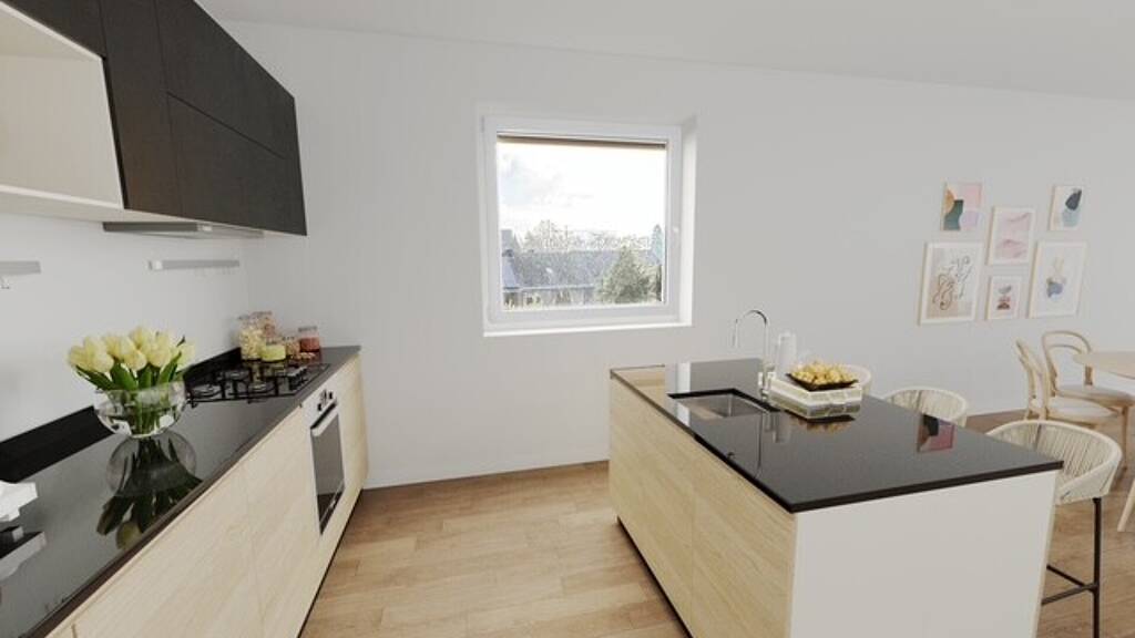 Noch bevor sich der Flur zum Wohnzimmer öffnet, erreichen Sie linkerhand die Küche, die ausreichend Platz für Ihre individuelle Küchenplanung bereithält.