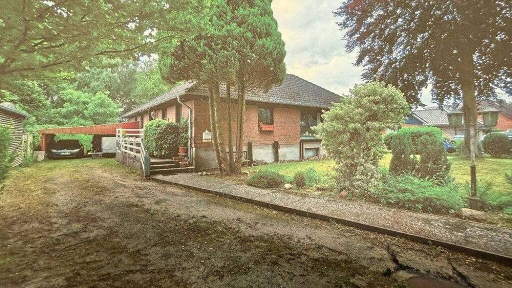 Dieser Walmdach-Bungalow ist im Jahr 1978 erbaut worden und verfügt über eine große Wohnstube mit Ess-Diele, vier weitere Zimmer, offenen Kamin, Hauswirtschaftsraum mit eigenem Eingang und einen kompletten Vollkeller. Der Bungalow ist als Holzständerbauweise mit ½ steinigen, roten Verblender gebaut und hat isolierverglaste Holzfenster (Mahagoni). Das Grundstück, das eine Größe von ca. 1.000 qm hat, ist schön bewachsen und verfügt zusätzlich noch über ein Doppel-Carport mit Schuppen. Diese Immobilie ist sofort bezugsbereit und bietet mit einer Wohnfläche von ca. 153 qm ausreichend Platz für eine größere Familie, ist aber auch flexibel anders nutzbar und hat noch Gestaltungspotenzial. Sie können Ihren Ideenreichtum freien Lauf lassen.