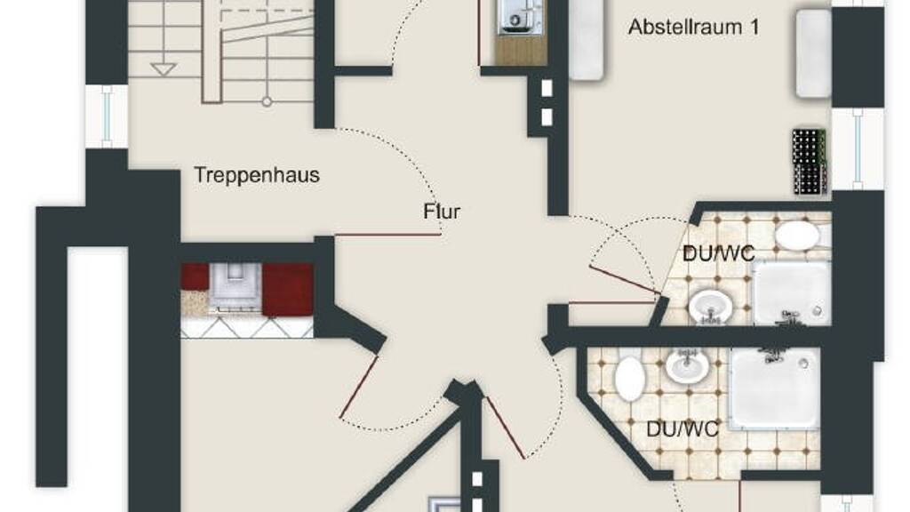 Die Maisonette-Wohnung überzeugt Sie im Obergeschoss mit einem Duschbad und im Dachgeschoss mit einer Wanne, jeweils mit Fenster. Den Balkon können Sie vom Wohnzimmer aus erreichen. Neben der Küche mit Platz für eine Essecke gehören noch 3 weitere Zimmer, die zurzeit als Esszimmer und Schlafzimmer genutzt werden, zur Wohnung.