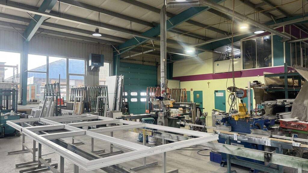 Der Bürotrakt verfügt über zwei große, helle Büroräume, einen Besprechungsraum, eine Küche sowie ein Damen- und ein Herren-WC. Ein weiterer Zugang führt, abgetrennt durch eine Tür, in die große, lichtdurchflutete Montagehalle, die den zentralen Arbeitsbereich des Gebäudes bildet. Innerhalb der Halle befinden zwei Toiletten für Mitarbeiter sowie ein Aufenthaltsraum. Eine Treppe führt in das darüberliegende, geräumige Lager.