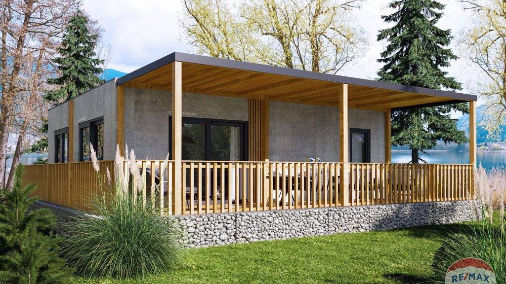 Durch die großen Schiebetüren gelangen Sie direkt aus dem hellen Wohnbereich auf die umlaufende Terrasse aus imprägniertem Kiefernholz. Hier genießen Sie einen beeindruckenden Ausblick über den Ossiacher See und die umliegenden Bergflanken. Das passende Geländer und das Tor runden das Gesamtbild stilvoll ab.