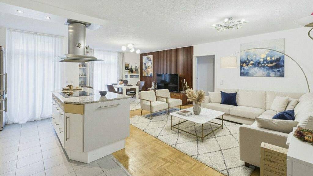 Der funktional durchdachte Grundriss bietet zeitgemäße Wohnverhältnisse und spricht eine breite Mieterzielgruppe an. Über die Diele erschließen sich ein weiteres Zimmer, das sich ideal als Arbeits- oder Gästezimmer eignet, ein separates Gäste-WC sowie der offen gestaltete Wohn- und Essbereich mit integrierter Küche und Kochinsel. Der private Bereich der Wohnung ist klar abgetrennt und umfasst ein Schlafzimmer mit angrenzendem Ankleidebereich sowie ein großzügiges Badezimmer. Dieses wurde im Jahr 2010 modernisiert und verfügt über eine bodennahe Dusche sowie großformatige, zeitlose Fliesen.