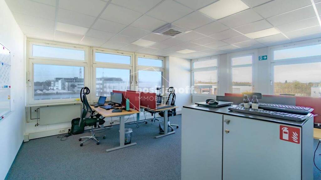 Insgesamt stehen Ihnen ein großer Empfangs-/Warte-/Ausstellungsbereich, sechs abgeschlossene Büroräume, separate WC´s für Herren und Damen, eine Küche sowie ein Besprechungs-/Konferenzraum zur Verfügung. Ergänzt wird das Angebot durch zwei großzügige Dachterrassen. Diese laden gerade in den Sommermonaten zu entspannten Mittagspausen oder Besprechungen ein.