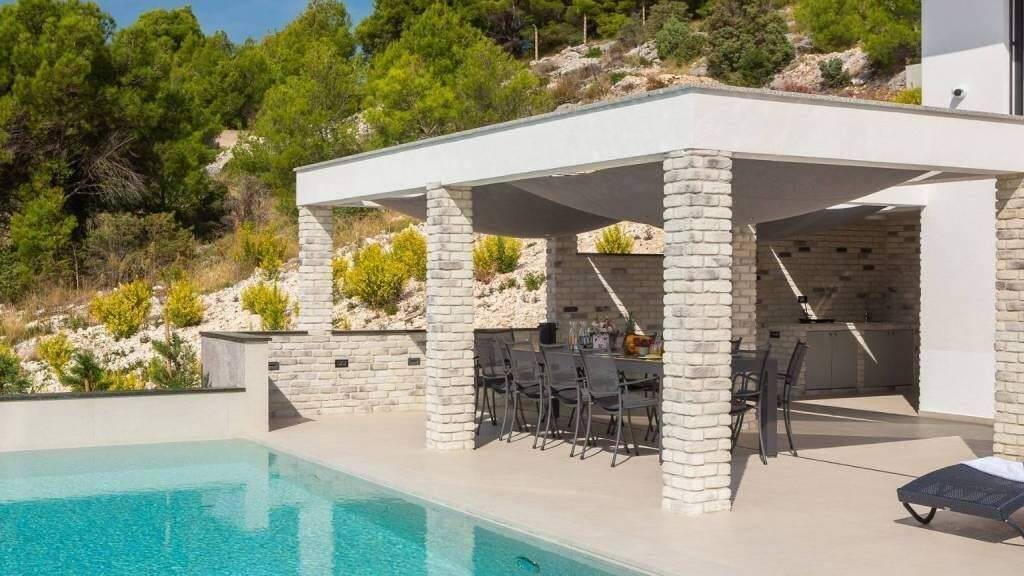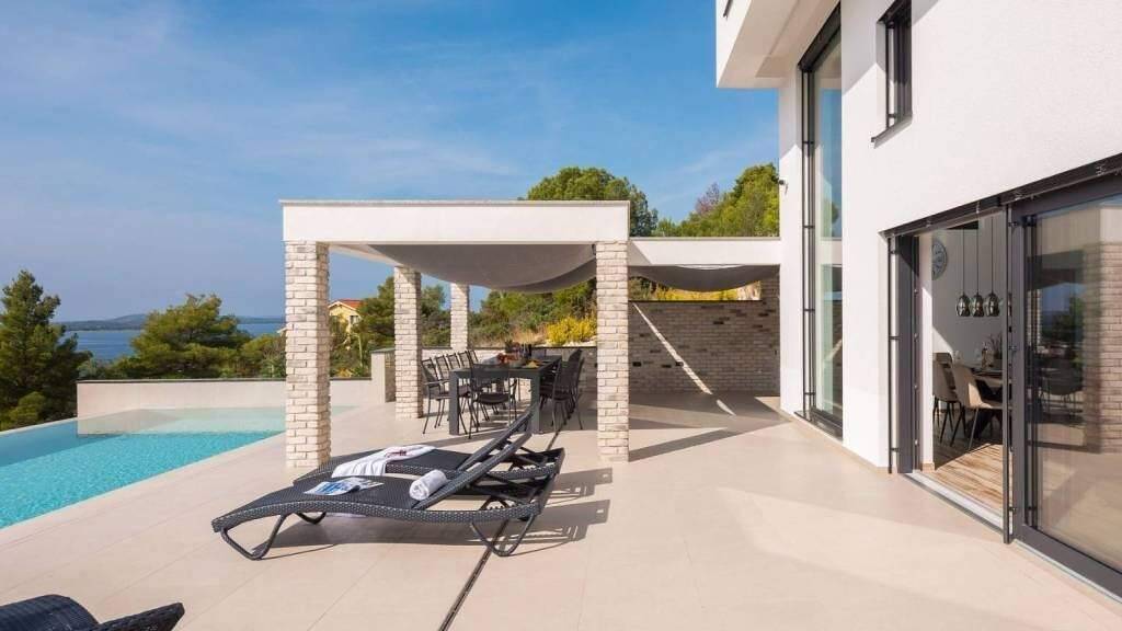 Zum Verkauf steht eine luxuriöse Villa in der Nähe von Sibenik, nur 150 Meter von der Küste entfernt. Zum Anwesen gehören auch Nebengebäude, und der Verkauf umfasst ein Baugrundstück und ein landwirtschaftliches Grundstück gegenüber dem Hauptgrundstück.