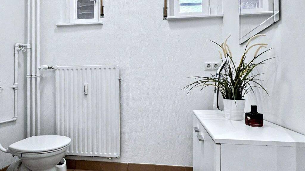 Der angrenzende Hinterraum mit einer Deckenhöhe von ca. 2,9 m bietet flexible Nutzungsmöglichkeiten, beispielsweise als Umkleide, Büro, Personalraum, Beratungszone oder als Erweiterung der Verkaufsfläche. Er ist mit Deckeneinbauspots ausgestattet und führt zu dem ebenfalls geräumigen und gepflegten Badezimmer, das über eine Deckenhöhe von ca. 3,02 m, ein WC, ein Handwaschbecken sowie kleine Fenster zur Belüftung verfügt.