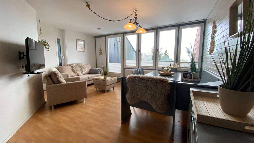 Es handelt sich um eine Ferienanlage mit offener Bauweise. Es ist eine neue Sauna mit Hallenbad vorhanden. Die Wohnung ist in erster begehrter Reihe mit einem unverbaubaren Blick in die Rheinebene. Die Wohnung hat 2 Schlafzimmer und ist komplett eingerichtet.