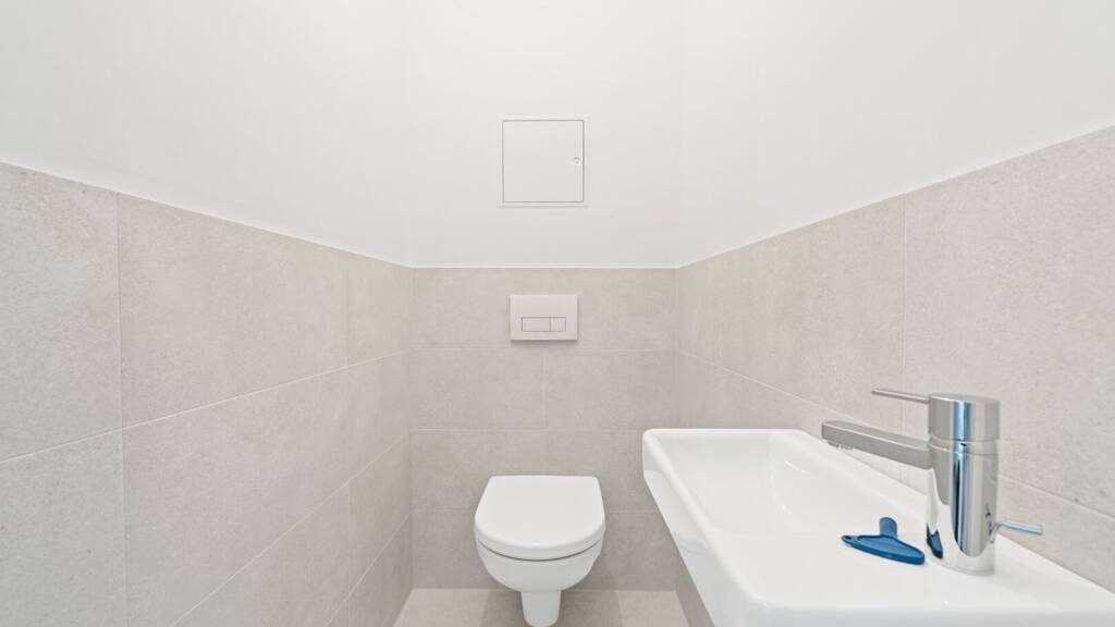 Zur Linken liegt das elegante, mit hellen Fliesen versehene Badezimmer, welches auf 4,40 m² mit einer Dusche, einem Handwaschbecken, einem Waschmaschinen-Anschluss sowie einer Toilette ausgestattet ist.