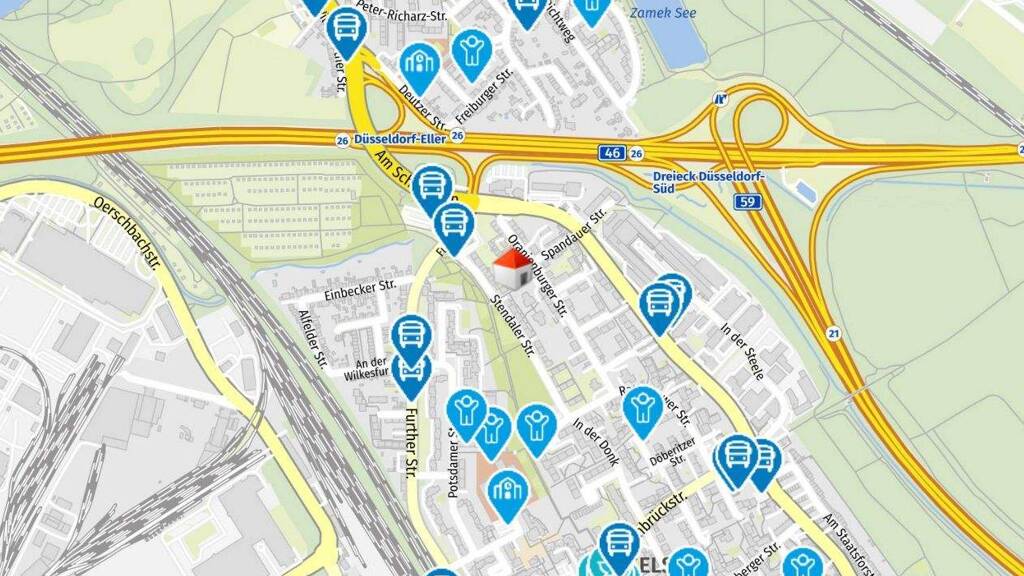 Die Verkehrsanbindung ist optimal: Die nächste Bushaltestelle ist nur wenige Schritte entfernt, und der S-Bahnhof Düsseldorf-Reisholz ist in ca. 400 Metern erreichbar. Für Autofahrer bieten die nahegelegenen Autobahnauffahrten zur A 59 und A 46 eine schnelle Verbindung in die umliegenden Städte.