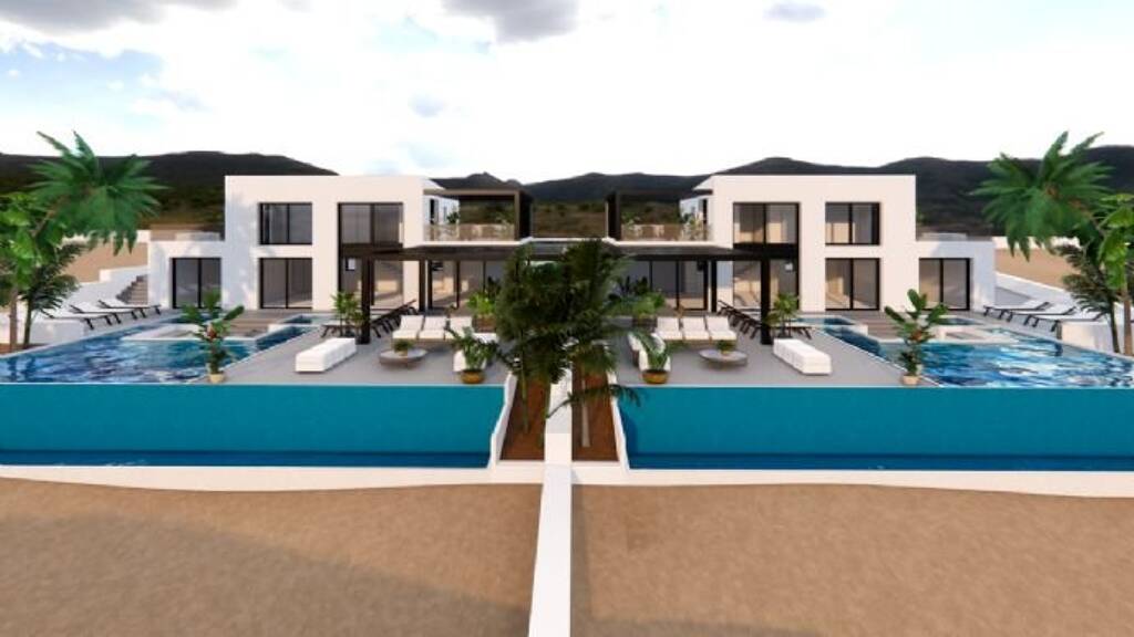 Zwei Villen werden Seite an Seite gebaut, aber jede wird ihren eigenen Eingang haben und innen mit ihren eigenen Pools und Unterhaltungsbereichen privat bleiben. Das Parken wird auf der Rückseite des Grundstücks mit Platz für 2 Autos sein. Ein langer, schmaler Eingang führt Sie zur Haustür und in die Küche und dann in den offenen Wohn-/Essbereich. Große Glastüren fließen in den Außenbereich, mit Stufen, die zu einem versunkenen Sitzbereich neben dem Pool führen. Es gibt auch eine Pergola mit Grill, Außenküche und Essbereich.