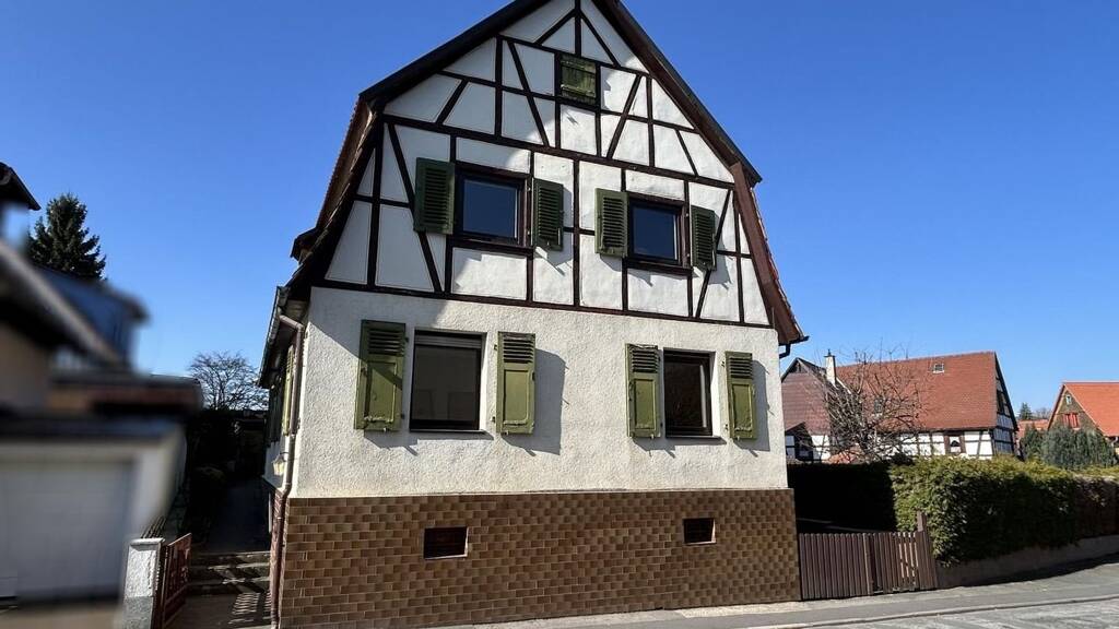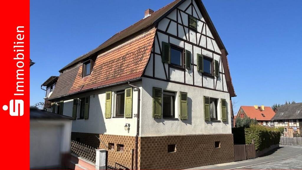 Gemütliches und sehr geräumiges Fachwerkhaus (OG+DG) mit Garage, großer Terrasse und kleinem Garten. Das Objekt verfügt über ca. 165 m² Wfl. auf 2 Etagen, sowie ca. 70 m² Nfl. im Keller und der Garage. Seinen Ursprung hat das Gebäude im Jahr 1919 wurde dann aber in mehreren Schritten in den 60er und 70er Jahren angebaut und vergrößert. Im Erdgeschoss befindet sich der Hauseingang mit großer Diele, ein geräumiges Wohnzimmer, die Küche, ein Esszimmer mit Zugang zum Innenhof und ein WC mit Dusche. Vom Flur aus gelangt man auf eine große, teils überdachte Terrasse auf der Garage. Im Dachgeschoss gibt es dann insgesamt 5 Zimmer und 2 Bäder. Weitere Nutzfläche gibt es im Dachgeschoss das über eine Treppe erreichbar ist. Weitere Nutzfläche steht Ihnen im Keller, der Garage und im Dachboden zur Verfügung. Die Immobilie ist bereits frei und vollständig geräumt, Ihre Renovierungsarbeiten könnten kurzfristig beginnen.