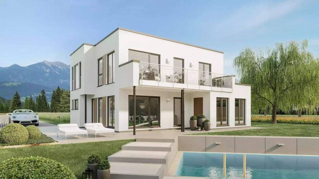 Als wahres Luxusdomizil für eine große Familie mit bis zu vier Kindern entpuppt sich dieses Fertighaus. Mit seiner klaren Linienführung, den geometrischen Formen und den großzügigen Verglasungen auf beiden Ebenen zeigt es deutliche Anlehnungen an die puristische Bauhaus-Architektur. Der kubische Baukörper wird erweitert von einem XXL-Übereck-Erker sowie einem zweigeschossigen Rechteck-Erker. Ein schöner Blickfang sind die Holzelemente an der Fassade, die die strenge Optik auf angenehme Weise auflockern. Für Spannung sorgt zudem der von schlanken Säulen getragene Balkon, der durch eine filigrane Brüstung begrenzt wird. Er bietet den Bewohnern nicht nur einen gemütlichen Platz zum Relaxen im Freien, sondern schützt auch den darunter liegenden Terrassenbereich vor unerwarteten Regengüssen. Im Innern des Hauses wird sicher schnell jedes Familienmitglied seinen ganz persönlichen Lieblingsplatz finden. Hobbyköche werden die große Küche im Erdgeschoss lieben, die sich bis in den Rechteck-Erker erstreckt. Dank der angrenzenden Speisekammer bleiben die Schränke und Regale frei für Geschirr, Töpfe und Pfannen - wovon bei einer sechsköpfigen Familie reichlich vorhanden ist. Als geselliger Treffpunkt könnte ein trendiger Tresen fungieren, der zugleich die einzelnen Funktionsbereiche optisch voneinander trennt. Kleinere Kinder werden sich vermutlich im weitläufigen Wohn- und Essbereich am wohlsten fühlen: Hier können sie nach Herzenslust spielen und toben, natürlich immer im Beisein der Eltern. Für Letztere steht im Erdgeschoss übrigens ein eigener Trakt bereit, der sich links an die Diele anschließt. Er umfasst ein barrierefreies Schlafzimmer mit integriertem Ankleidebereich sowie ein eigenes Bad mit Dusche. Komplettiert wird das Raumangebot der unteren Etage von einem Technik- bzw. Haustechnikraum und einem kompakten Gäste-WC. Das Obergeschoss gehört ganz dem Nachwuchs. Eine luftige Empore führt zu vier gut geschnittenen Kinderzimmern, die für jedes Alter einen großen Entfaltungsfreiraum bieten. Zwei von ihnen besitzen einen Zugang zum Balkon - genau wie das geräumige Bad mit Wanne und Dusche.