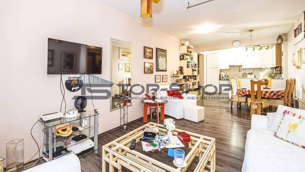 Ovaj prostrani stan odlikuje se funkcionalnim rasporedom prostorija koji ukljucuje dnevni boravak povezan s kuhinjom i blagovaonicom, dvije spavace sobe, kupaonicu s WC-om, hodnik te dodatno spremiste za odlaganje. Jugozapadna orijentacija stana osigurava obilje prirodnog svjetla tijekom cijelog dana, a s prozora se pruza lijep pogled na okolicu, sto dodatno doprinosi ugodi boravka. Stan se nalazi na mirnoj lokaciji, sto ga cini idealnim izborom za obitelji ili pojedince koji traze tisinu i privatnost, a istovremeno zele biti povezani s gradskim sadrzajima.