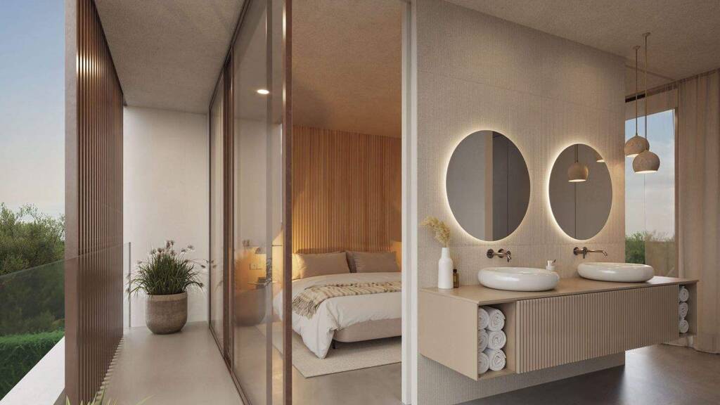 Das Hauptschlafzimmer im ersten Stock wurde strategisch so positioniert, dass auch diese offenen Ausblicke genutzt werden und Privatsphäre, Licht und visuelle Geräumigkeit kombiniert werden.