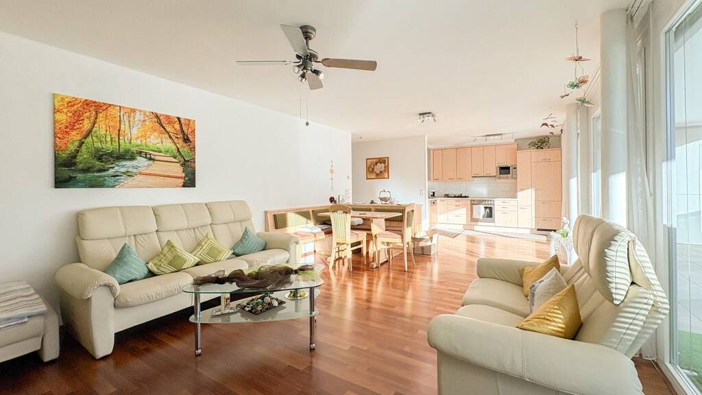 Schon beim Betreten empfängt Sie ein einladender Eingangsbereich, der in den lichtdurchfluteten Wohnraum mit verglaster Loggia führt. Hier lässt es sich wunderbar entspannen, durchatmen und den Alltag hinter sich lassen.