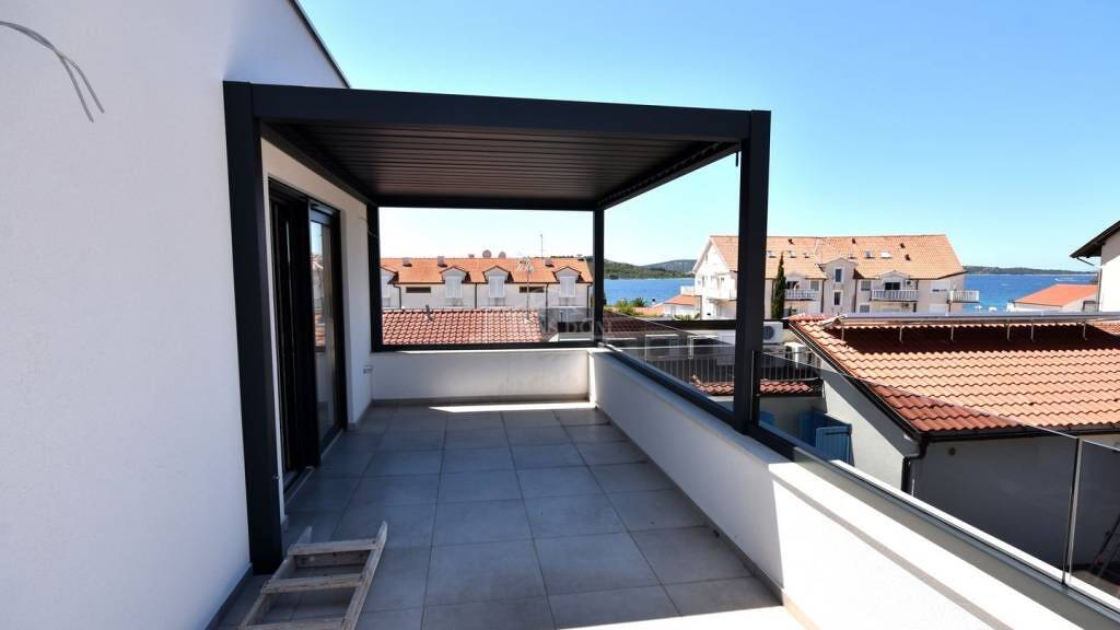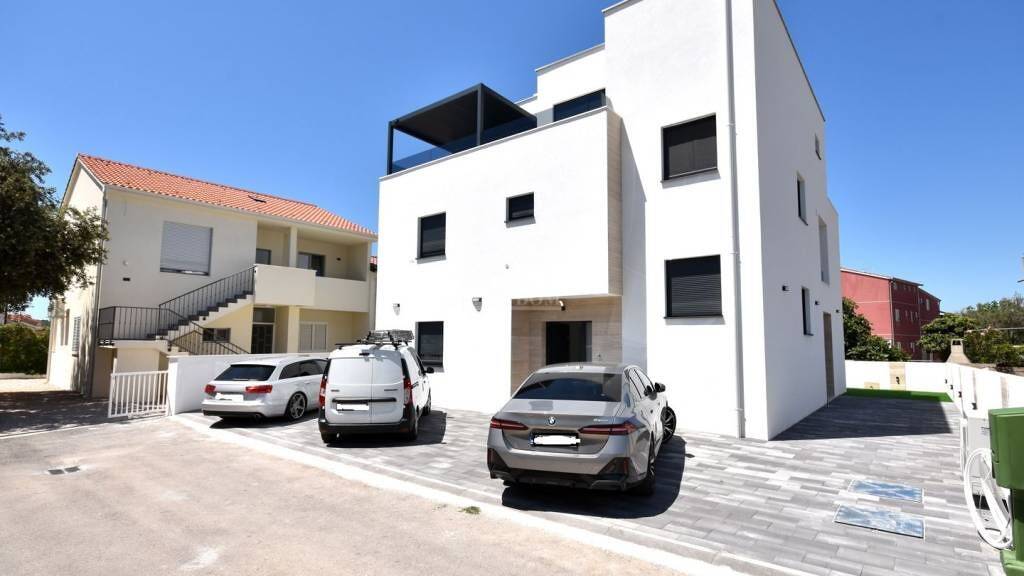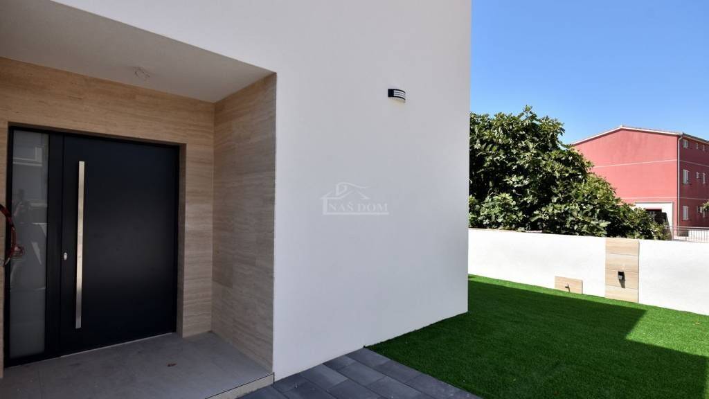 Vodice, Srima - **NEUBAU**: Zum Verkauf steht ein Doppelhaus mit modernem Design und drei Etagen: Erdgeschoss + 1. Stock + 2. Stock. Das Haus wurde mit hochwertigen Materialien gebaut und entspricht den neuesten Baustandards. Zur Ausstattung gehören: 10 cm Styropor-Fassade, PVC-Fenster mit Rollläden, Schiebetüren, hochwertige Bodenbeläge, moderne Badezimmersanitäranlagen, elektrische Fußbodenheizung mit Wärmepumpe, Vorinstallation für Solarpaneele, Internet-/TV-Installationen in den Schlafzimmern und im Wohnzimmer, Klimaanlagen in den Schlafzimmern und im Wohnzimmer, gepflasterte Parkplätze...