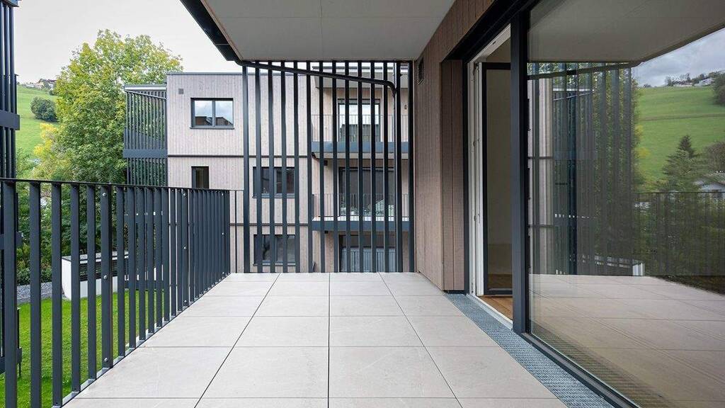 Die rund 11 m² große Terrasse erweitert den Wohnraum ins Freie und lädt dazu ein, die beeindruckende Bergkulisse in entspannter Atmosphäre zu genießen.