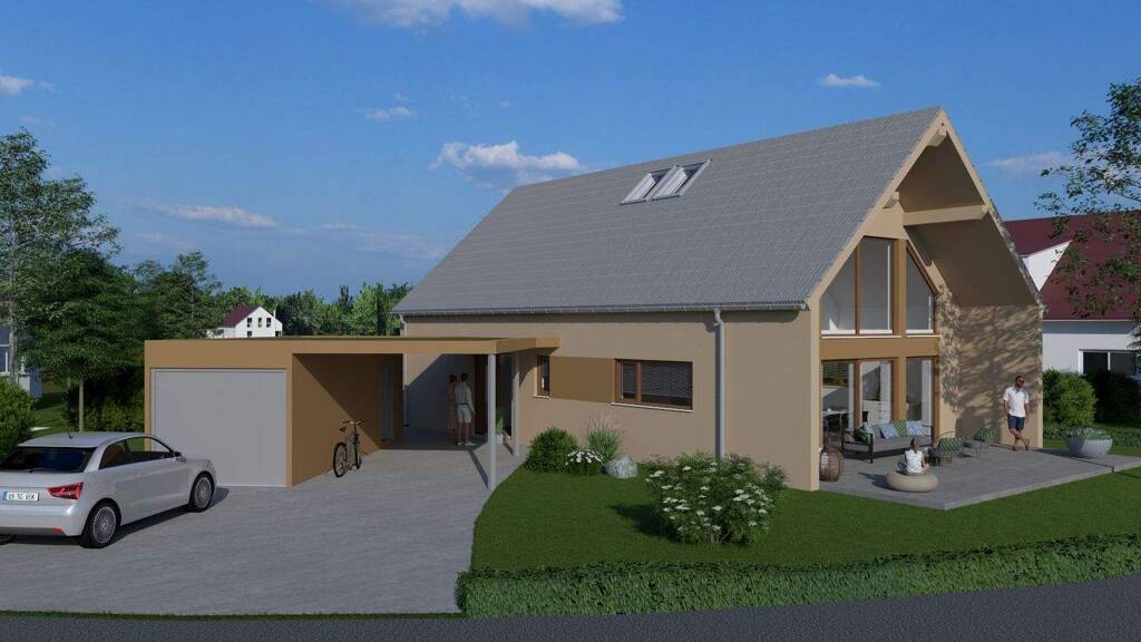 Dieses freistehende Einfamilienhaus in Mössingen überzeugt durch eine außergewöhnliche, nicht alltägliche Architektur, die Klarheit, Großzügigkeit und Wohnqualität auf hohem Niveau vereint. Die klare Kubatur mit zeitgemäßer Satteldach-Interpretation verleiht dem Gebäude eine ruhige, selbstbewusste Präsenz und fügt sich zugleich harmonisch in das gepflegte Wohnumfeld ein. Das architektonische Leitmotiv folgt konsequent dem Anspruch, Licht, Raum und Funktionalität in Einklang zu bringen. Herzstück des Hauses ist der firstoffene Koch-, Ess- und Wohnbereich, der sich mit seiner beeindruckenden Raumhöhe und der großzügigen, nach Süden ausgerichteten Fensterfront als lichtdurchfluteter Lebensmittelpunkt präsentiert. Die Galerie im Dachgeschoss schafft visuelle Verbindungen zwischen den Ebenen und unterstreicht das offene, luftige Raumgefühl. Das Grundrisskonzept ist ideal auf die Bedürfnisse einer jungen Familie abgestimmt: Der private Elternbereich mit Schlafzimmer, Ankleide und Hauptbad befindet sich bewusst im Erdgeschoss und bietet Rückzug sowie Komfort auf einer Ebene. Der Kinder- und Jugendbereich im Dachgeschoss bildet mit zwei Zimmern, eigenem Bad und Galerie eine eigenständige, geschützte Ebene. Diese klare Zonierung sorgt für Alltagstauglichkeit, Ruhe und langfristige Flexibilität. Ein überdachter Hauszugang, ein breiter Carport sowie eine extra lange Garage unterstreichen den durchdachten Charakter des Hauses und bieten komfortable Lösungen für Ankommen, Abstellen und Stauraum. Bitte beachten Sie: im angegebenen Kaufpreis ist das Haus, mit Grundstück, Garage und Carport sowie die Baunebenkosten samt Gebühren mit enthalten!!!
