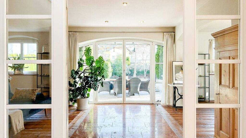 Schon im Eingangsbereich zeigt sich die besondere Qualität der Immobilie: Edler Untersberger Marmor begleitet vom Vorraum über die Diele bis in den Wohnbereich und verleiht dem Haus eine elegante, zeitlose Note. Die offene Gestaltung ermöglicht bereits beim Eintreten einen Blick durch das Haus bis hinaus in den Garten - ein Eindruck von Weite und Transparenz.