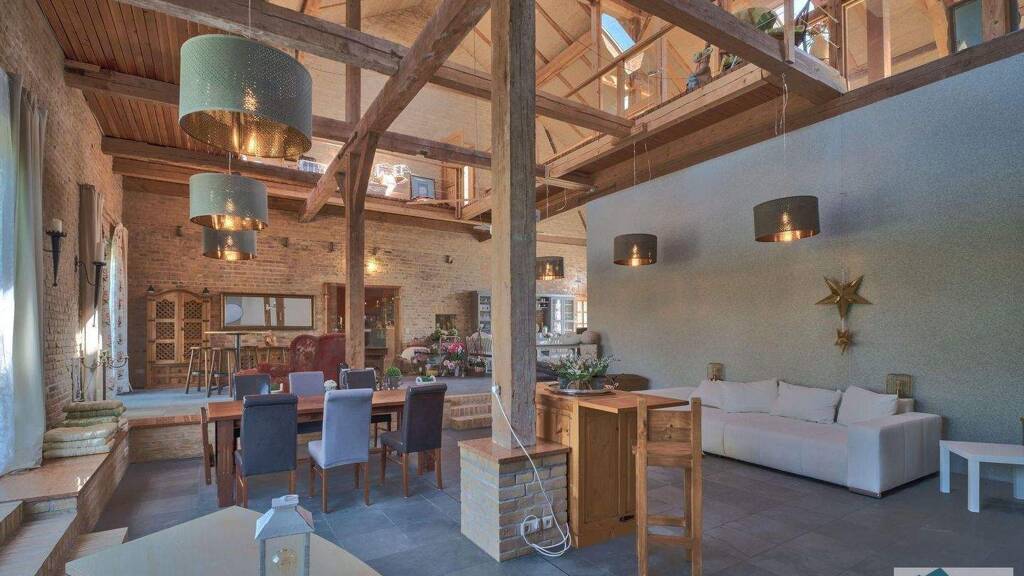 Hier verschmelzen Tradition und Moderne auf einzigartige Weise: Originale Bauelemente wie Sichtmauerwerk, alte Holzbalken und die originale Kappendecke auf Stahlträgern wurden behutsam erhalten. Dazu gesellen sich moderne Akzente wie eine sparsame Gebäudetechnik mit Gasbrennwerttechnik in Kombination mit einer kombinierten Fußboden- und Konvektorheizung. Alternativ kann die gesamte Scheune auch mit einer zentralen Holzbefeuerungsanlage über die kombinierte Fußboden- und Konvektorheizung warm gehalten werden. Hochwertige Bäder mit Whirlpool, Badewanne und Dusche, zweifach verglaste Holzfenster mit Sprossen, eine zentrale Staubsaugeranlage, Balkone und ein Kamin runden das Wohnkonzept ab und sorgen für ein unverwechselbares Ambiente voller Freiheit und Charakter.
