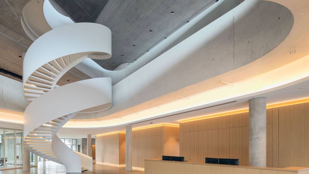 Im Inneren bildet das zentrale Atrium, das kommunikative Herzstück des Gebäudes. Als offener Verteilerraum mit eindrucksvoller weißer Stahlwendeltreppe verbindet es sämtliche Ebenen auf elegante Weise und schafft Transparenz, Offenheit und eine besondere Arbeits- und Aufenthaltsqualität. Die Fläche eignet sich zudem hervorragend für Empfänge, Präsentationen, interne Veranstaltungen oder eine Nutzung als Aula mit bis zu 199 Personen.