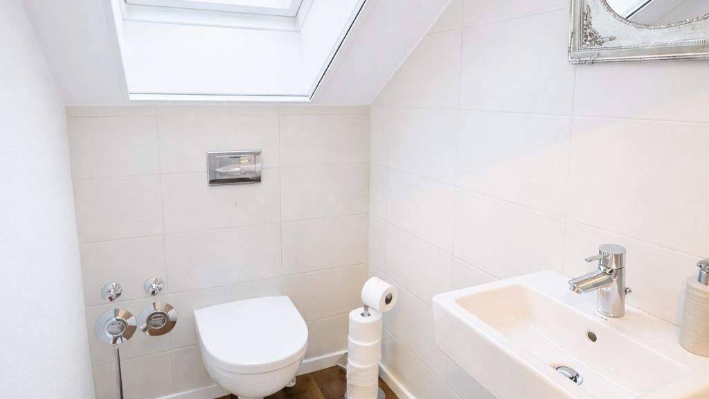 Ein Schlafzimmer bietet ausreichend Rückzugsmöglichkeiten, während ein weiteres Zimmer flexibel als Arbeits-, Gäste- oder Hobbyraum genutzt werden kann. Das Badezimmer wird durch ein separates Gäste-WC ergänzt und unterstreicht den praktischen Wohnkomfort.