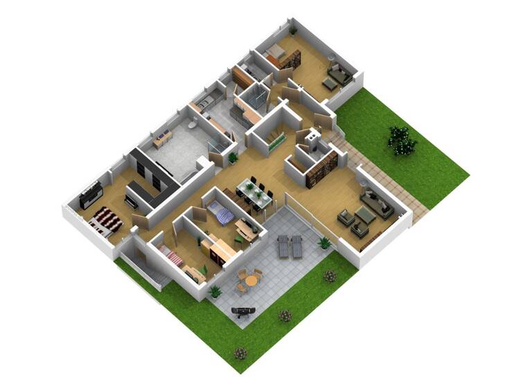 Die großzügige Terrasse mit Kunststeinplatten sowie der liebevoll angelegte Garten mit Rasen, Ziersträuchern und Bäumen bieten viel Raum zur Erholung.