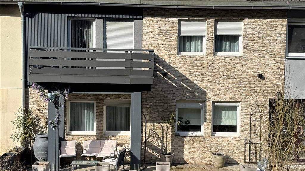 Das ursprünglich 1972 in Fertigbauweise erbaute Gebäude wurde 1995 in Eigentumswohnungen aufgeteilt. Bei diesem Angebot handelt es sich um zwei übereinanderliegende Eigentumswohnungen, die 2010 mit Baugenehmigung über einen Durchbruch mit Wendelttreppe zusammengelegt worden sind. Der große Vorteil ist, daß sämtliche Versorger wie Wasser, Strom und Heizung eigenständig und somit unabhängig von den anderen Eigentümern sind. Eine eigene städtische Wasseruhr, ein eigener Stromzähler und eine eigenständige Öl-Zentral-Heizung mit Warmwasser-Versorgung sind vorhanden. Rein formell ist es zwar eine Eigentumswohnung, physisch kann man aber von einem Reihenmittelhaus sprechen. Das Haus besitzt über Sondernutzungsrechte über einen eigenen Garten vor dem Haus und über einen kleinen schönen Garten am Bachlauf hinter dem Haus. Hier können Sie die West- bzw. Abendsonne genießen oder entspannen auf der geräumigen und überdachten Terrasse.