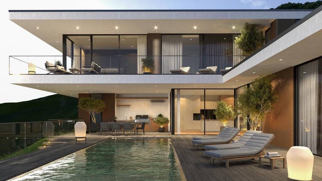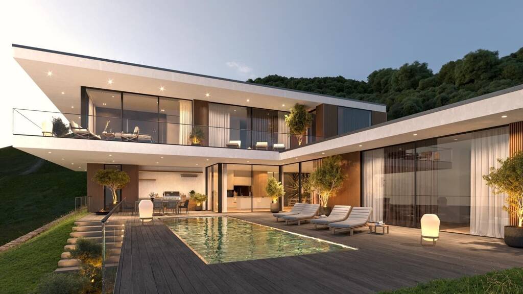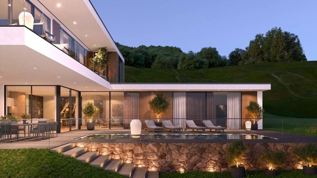In bester Lage mit Süd-West-Ausrichtung und herrlichem Blick auf den Mondsee wird ein zweigeschossiges Einfamilienhaus errichtet, das durch außergewöhnliche Architektur und hochwertige Materialien besticht. Das Bauwerk bietet maximale Privatsphäre im gesamten Haus und Garten. Auf einem ca. 1.159 m² großen Grundstück entstehen ca. 338 m² reine Wohnfläche und einer Nutzfläche von ca. 435 m² zuzüglich Terrassen, Pool undBalkone. Die großzügigen Außenbereiche umfassen eine ca. 124 m² große Terrasse und einen ca. 55 m² großen, voll überdachten Balkon. Beide Flächen sind mit einem Echtholzbelag der Resistenzklasse 1 (wie Ipe) ausgeführt, welcher eine Haltbarkeit von bis zu 30 Jahren garantiert. Die Wohnräume beeindrucken mit einer lichten Raumhöhe von 3 Metern, abgehängten Decken und Fenstern sowie Schiebetüren in voller Raumhöhe ohne sichtbare Stürze. Zargenlose, bündige Innentüren mit einer Höhe von ca. 2,7 Metern unterstreichen das moderne Design. Im Außenbereich befindet sich auf der ca. 124 m² großen Terrasse ein Edelstahlpool mit den Maßen 9x3 Meter, der mit einer Solar-Abdeckung ausgestattet ist. Ein optionaler überdachter Bereich bietet Platz für eine großzügige Outdoor-Küche. Die Energieversorgung des Hauses erfolgt über eine Photovoltaikanlage mit einer Leistung von ca. 10 kWp und eine Wärmepumpe, die sowohl Heizung als auch Raumkühlung übernimmt. Für Elektrofahrzeuge steht eine 11 kW Lademöglichkeit in der direkt angrenzenden Garage bereit, die Platz für drei Fahrzeuge sowie Fahrräder auf einer Fläche von ca. 79 m² bietet. Das Haus ist mit einem modernen BUS-System für sämtliche elektrische Anlagen ausgestattet, das individuell programmierbar ist und sich von jedem Ort per App steuern lässt. Im Obergeschoss befinden sich drei Schlafzimmer, die jeweils über ein en-suite Badezimmer verfügen. Ein weiteres Bad liegt im Fitnessraum, in dem sich auch eine Sauna mit direktem Zugang zum Pool befindet. Die Bauweise erfolgt in Massivbauweise, und die Umsetzung erfolgt durch lokale Fachfirmen auf Basis von präzisen Statik- und Architektenplänen sowie den Ö-Normen und den allgemein gültigen technischen Standards. Dieses Einfamilienhaus bietet nicht nur eine außergewöhnliche Aussicht auf den Mondsee, sondern auch eine perfekte Symbiose aus innovativer Technologie und luxuriösem Wohnen in einer der begehrtesten Lagen der Region.