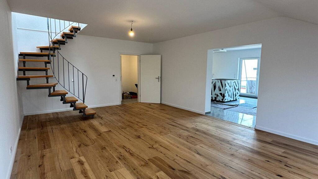 Diese stilvoll sanierte Maisonettewohnung vereint modernes Wohnen mit einem offenen, durchdachten Raumkonzept - ideal für anspruchsvolle Singles oder Paare, die Wert auf Qualität und ein besonderes Wohngefühl legen. Bereits beim Betreten der Wohnung spürt man die gelungene Verbindung aus Großzügigkeit und Wohnlichkeit. Im Obergeschoss bildet der offen gestaltete Wohn- und Essbereich das Herzstück der Wohnung. Große Fensterflächen sorgen für viel Tageslicht und schaffen eine angenehme, einladende Atmosphäre. Von hier aus gelangen Sie direkt auf den Balkon - ein perfekter Ort, um den Tag entspannt ausklingen zu lassen. Die hochwertige Nolte Einbauküche mit großzügiger Kochinsel fügt sich nahtlos in den Wohnbereich ein und wird durch erstklassige Geräte von Miele ergänzt. Sie ist nicht nur funktional, sondern auch ein echter Blickfang für alle, die gerne kochen und Gäste empfangen. Im Dachgeschoss erwarten Sie ein ruhiges Schlafzimmer sowie ein separates Büro - ideal für Homeoffice oder als Rückzugsort. Das modern gestaltete Badezimmer überzeugt mit einer klaren, zeitlosen Ausstattung. Die Wohnung wurde im Jahr 2025 umfassend saniert. In allen Wohnräumen wurde neues, hochwertiges Parkett verlegt, das für ein warmes und elegantes Wohngefühl sorgt. Teilweise erneuerte Fenster unterstreichen den modernen Gesamtzustand der Immobilie. Diese Maisonettewohnung bietet eine perfekte Kombination aus stilvollem Design, durchdachter Raumaufteilung und hochwertiger Ausstattung - ein Zuhause, das sofort begeistert.