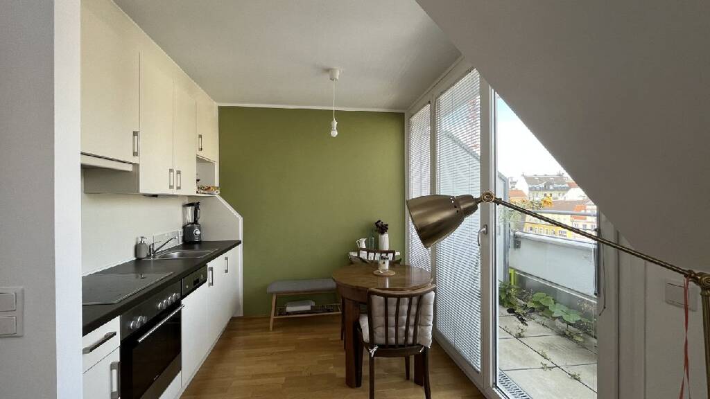 Die ca. 32 m² große Wohnung befindet sich im Dachgeschoss eines schönen Neubauhausesund gliedert sich in einen Vorraum, ein Einzelwohnraum mit separierter Küchennische und ein Badezimmer mit Toilette.