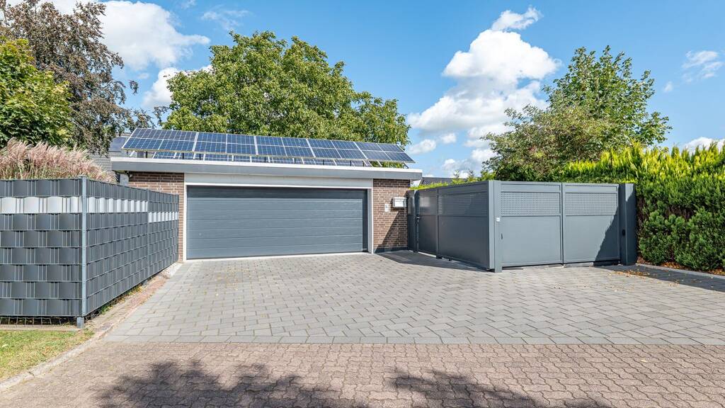 Nun zum Außenbereich: Dieser ist pflegeleicht und dennoch mit viel Liebe angelegt. Die Rasenfläche ist überaus großzügig und rundum eingefriedet. Das Carport hat zudem einen integrierten Schuppen, der Platz für diverse Gartengeräte und Co. bietet, und auf dem Dach befindet sich eine Solaranlage. In der Doppelgarage gibt es außerdem eine kleine Werkstattecke.