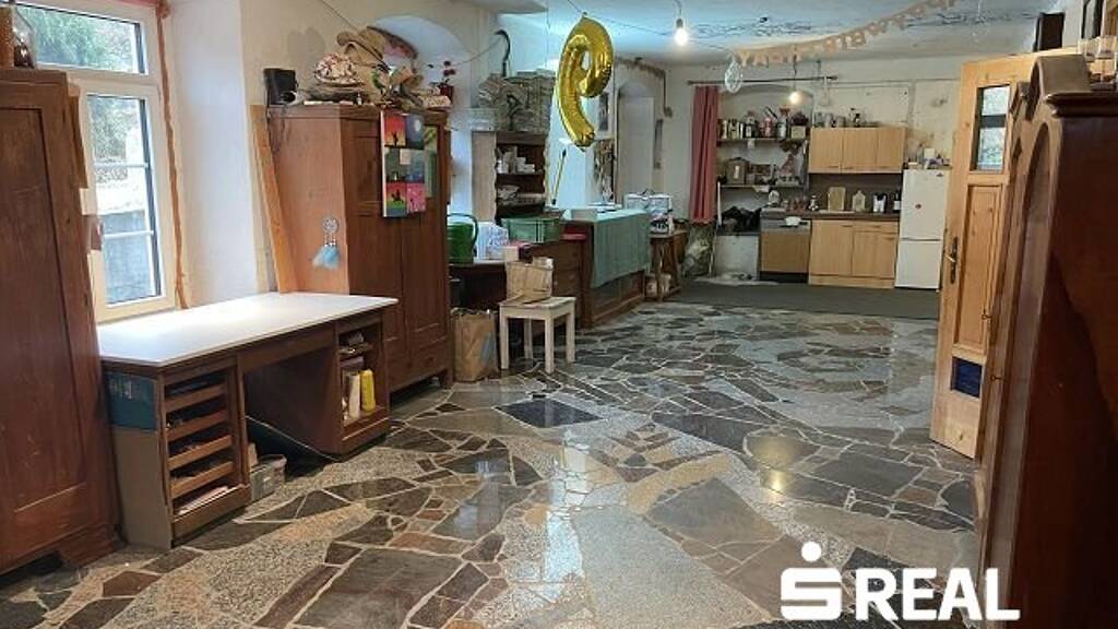 Im Erdgeschoss erwartet Sie ein beeindruckender, ca. 86 m² großer Raum mit Fliesenboden und Fußbodenheizung, ideal als offener Wohn- oder Hobbybereich. Auf gleicher Ebene gibt es einen Technikraum und das Stiegenhaus. Das Mauerwerk im Erdgeschoss befindet sich im ursprünglichen, unsanierten Zustand und verströmt damit einen besonderen Altbau-Charme.