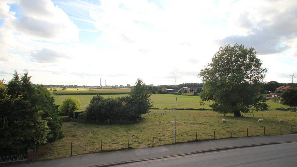 Das Haus betreten Sie über einen überdachten Windfang, der Sie und Ihre Gäste wettergeschützt empfängt. Im Erdgeschoss erwarten Sie eine helle Diele, ein Schlafzimmer, das großzügige Wohnzimmer mit Panorama-Fensterfront und herrlichem Blick in die Feldmark, die Küche sowie ein Vollbad. Für zusätzlichen Komfort sind alle Fenster im Erdgeschoss mit Außenrollläden ausgestattet.