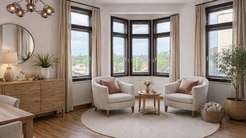 Die großzügigen Wohnräume bieten vielfältige Gestaltungsmöglichkeiten für Wohnen, Arbeiten und Schlafen. Große Fenster sorgen für viel Tageslicht und ein angenehmes Wohngefühl.