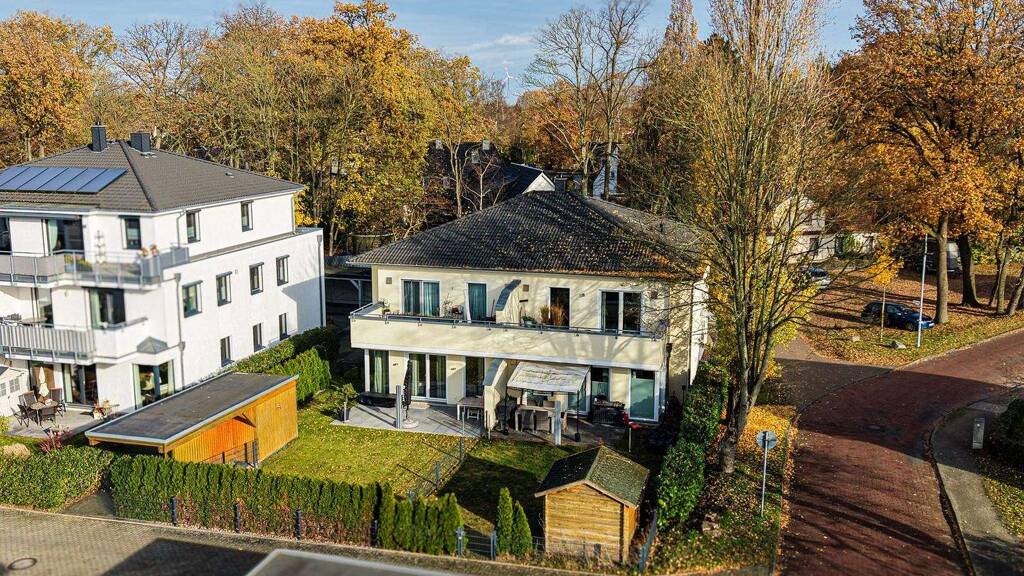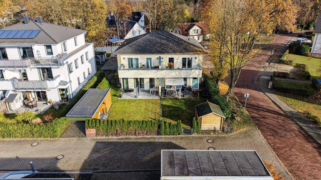 Highlights im Überblick: . Wohnen wie im Haus: Eigener Eingang, nur vier Wohneinheiten im Haus . Perfekte Lage: Ruhig gelegen an einem Privatweg, ohne Durchgangsverkehr . Südterrasse mit Garten: Ca. 21 m², sonnig, eingezäunt - ideal zum Entspannen oder Grillen . Offenes Wohnkonzept: Großzügiger Wohn-/Essbereich (ca. 37 m²) mit hochwertiger Nolte-Küche und Miele-Geräten . Lichtdurchflutete Räume: Große Fensterfronten sorgen für viel Tageslicht . Exklusive Ausstattung: Stäbchen-Eichenparkett in allen Wohnräumen, Fußbodenheizung, hochwertige Sanitärausstattung . Modernes Bad: Ebenerdige Dusche, Badewanne, Handtuchheizung, Fenster und edles Design . Praktischer Hauswirtschaftsraum: Ca. 6 m² mit Waschmaschinen- und Trockneranschluss . Energieeffizient: Be- und Entlüftungsanlage in allen Wohnräumen . Komfortables Parken: Carport auf dem eigenen Grundstück, zusätzlicher Stellplatz sowie ein separater Geräteschuppen . Schnelles Internet: Glasfaseranschluss vorhanden
