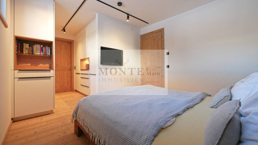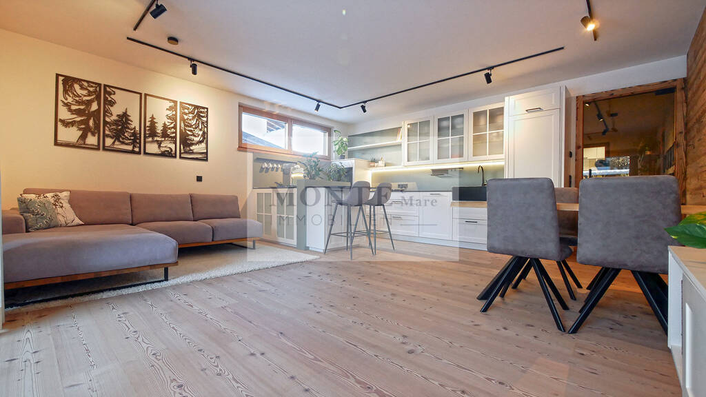 Das gemütliche Wohnzimmer mit integrierter Landhausküche und kleinem Tresen lädt zu geselligen Abenden ein. Die hochwertige Ausstattung der Wohnung lässt keine Wünsche offen: Einbauschränke bieten optimalen Stauraum, während die Altholzvertäfelungen und der Echtholzboden für eine warme, einladende Atmosphäre sorgen.