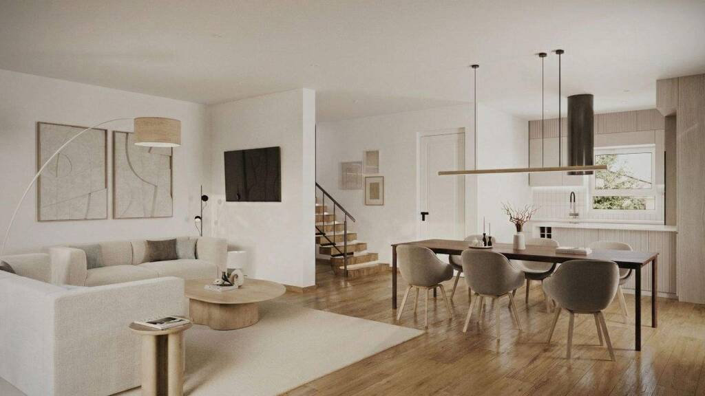 Das hier angebotene Reihenmittelhaus mit ca. 130 m² Wohnfläche, verteilt auf insgesamt 5,5 Zimmer, besticht durch eine gelungene und familienfreundliche Raumaufteilung. Alle Wohnräume sind mit bodentiefen Fenstern inklusive elektrischen Rollläden ausgestattet und bieten viel Entfaltungsspielraum für eine Familie. Im Erdgeschoss präsentiert sich das Wohnzimmer durch die große Schiebetür sehr hell und bietet Platz für eine gemütliche Wohnlandschaft. Prädestiniert für geselliges Kochen ist die offene Küche mit angrenzendem Essbereich. Zusätzlich sind ein Gäste-WC sowie eine praktische Garderobe vorhanden, die auch als Abstellraum genutzt werden kann. Auf der Terrasse und im Garten können Sie die Sonne genießen. Das Obergeschoss verfügt neben einem Tageslichtbad mit bodentiefer Dusche, Waschbecken und WC über drei schöne Zimmer, die optimal als Kinder- oder Arbeitszimmer genutzt werden können. Das Dachgeschoss bildet ein zusätzliches Highlight und eignet sich perfekt als persönlicher Rückzugsort der Eltern. Hier befindet sich nicht nur das Schlafzimmer mit großzügiger Ankleide, sondern ebenso das Arbeitszimmer, welches eine Rückzugsmöglichkeit und viel Ruhe bietet. Das Elternbad steht den übrigen Räumen in nichts nach und ist mit einer Badewanne ausgestattet. Das Untergeschoss ist komplett unterkellert. Zwei Abstellräume, wovon einer als vollwertiges Zimmer ausgebaut wird, sowie der Technik- und Waschraum sind dort vorhanden. Abgerundet wird das Angebot durch einen Stellplatz (zzgl. 10.000 EUR). Die Grundrisse können noch komplett nach Ihren Vorstellungen umgestaltet und individuell angepasst werden.