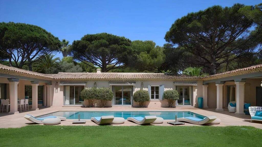 Nur 800 Meter von den Stränden Tahiti und Pinet entfernt erstreckt sich dieses seltene Anwesen im Herzen eines prachtvollen gärtnerischen Parks von über 11.700 m², gesäumt von majestätischen Pinien. Abseits der Blicke verkörpert dieses außergewöhnliche Domizil das perfekte Gleichgewicht zwischen Privatsphäre, Eleganz und mediterranem Lebensstil.