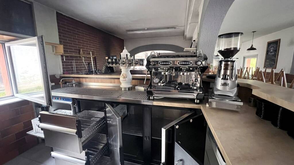 Ausstattung Küchenbereich: - Edelstahl-Spültischanlage - Edelstahl-Kühlschrank/Untertischkühlschrank - Gewerblicher Pizzaofen / Backofen (einfaches Fach, Elektro) - Große Teigknetmaschine / Spiralkneter - Gewerblicher Kühlschrank mit Glastür - Kaffeemaschine (Siebträger, 2 Gruppen) - Doppelzapfanlage / Bierzapfhähne - Eis-/Kühlunterbau mit mehreren Schubladen (Edelstahl)