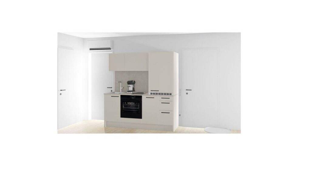 Nach dem Betreten der knapp 35 m² großen 2-Zimmer-Wohnung befindet man sich bereits in der Wohnküche mit etwa 20 m² Größe. Der Raum ist offen gestaltet und bietet viel Licht dank bodentiefen Fensterflächen und vorgelagertem Balkon. Hier lassen sich eine Couch und ein gemütlicher Essbereich wunderbar einrichten. Ein zeitloser Küchenblock mit Hängeschränken und sämtlichen Geräten ist selbstverständlich Teil der Ausstattung.