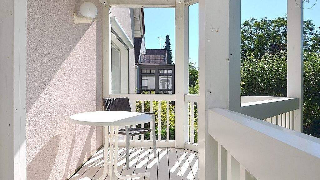 Der angrenzende Balkon mit Tisch und Stuhl lädt zum Verweilen ein.