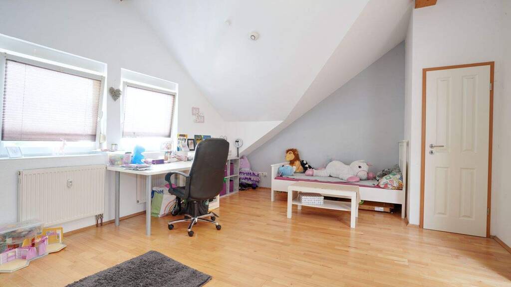 Die größere Wohneinheit erstreckt sich über das Obergeschoss und das Dachgeschoss. Sie bietet fünf großzügige Zimmer, zwei Bäder und eine Küche - perfekt für Familien oder Paare mit Platzbedarf. Vom Schlafzimmer im Dachgeschoss aus gelangen Sie auf einen kleinen Balkon, während sichtbare Echtholzbalken eine warme und wohnliche Atmosphäre schaffen. Ein elektrisches Dachfenster im Treppenhaus sorgt dabei für natürliches Licht.
