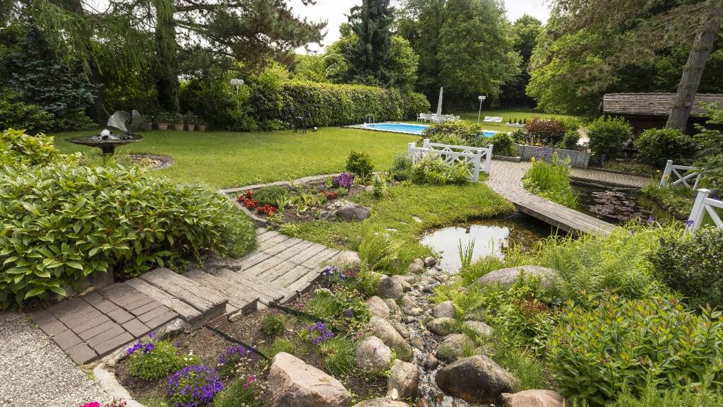 Der gepflegte, weitläufige Garten besticht durch eine dichte umlaufende Bepflanzung, die maximale Privatsphäre schafft. Neben einem gärtnerisch angelegten Bereich mit Zierteich verfügt das Grundstück über einen beheizten Außenpool mit einer Größe von ca. 11 mal 5,5 Metern, der mit einer aufschiebbaren Überdachung ausgestattet ist.