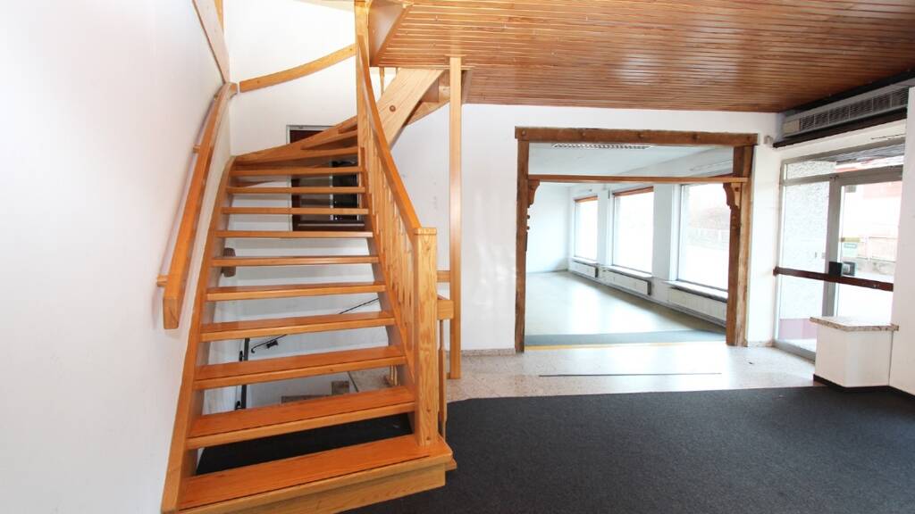 Unterhalb dieser Wohnung im mittleren Teil des Hauses befindet sich die zuletzt als Laden genutzte Fläche. Diese zieht sich bis zum linken Teil des Gebäudes, welches 1989 angebaut wurde und misst im unteren Bereich gut 75 qm zzgl. eines ca. 9 qm großen Badezimmers mit Toilette und Dusche. Herzstück ist hier die hochwertige Holztreppe welche in den zweiten Stock des linken Teils führt. Hier befindet sich der ebenfalls vorher gewerblich genutzte Raum mit ca. 60 qm.